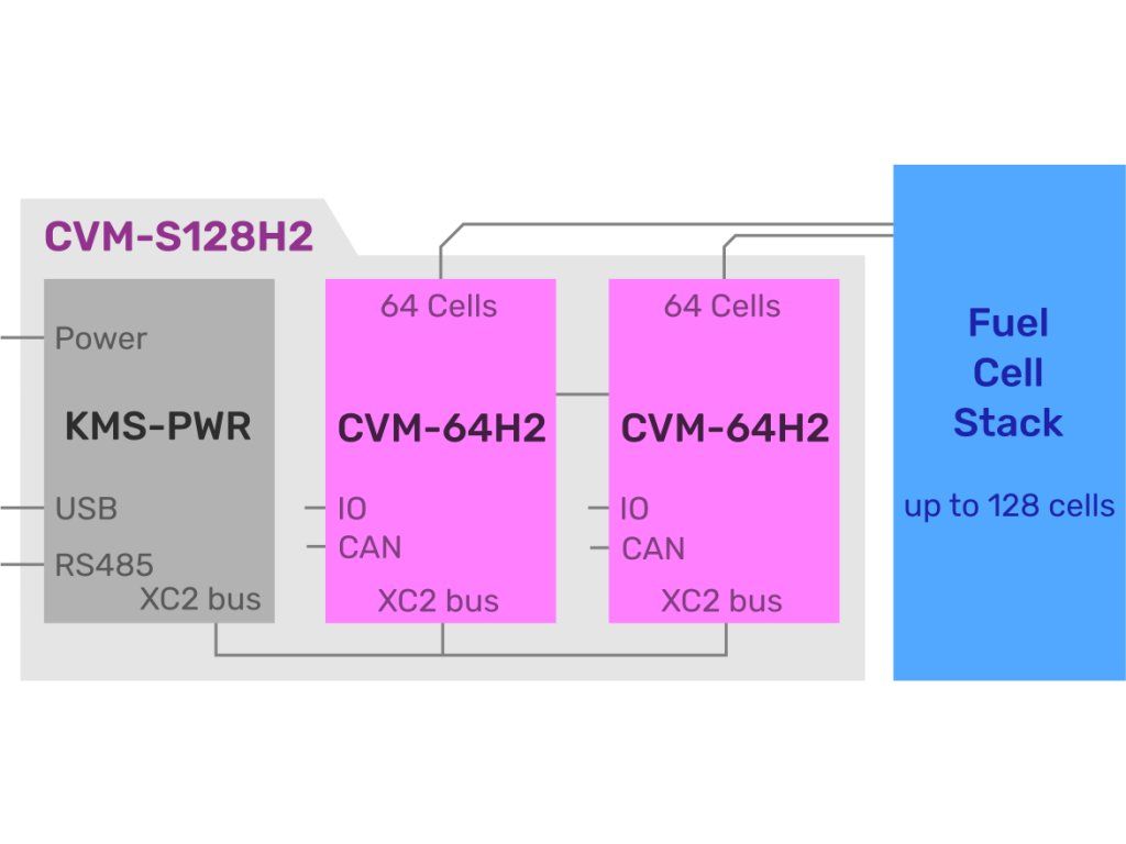 Adapted for research and testing purposes, the CVM-64H2 Series offers excellent accuracy and is designed primarily for hydrogen fuel cells and smaller electrolyzers. These ready-to-use cell voltage monitor sets are easily integrated into specialized applications and allow direct connection to a PC via USB or to a PLC via RS-485 or CAN bus.