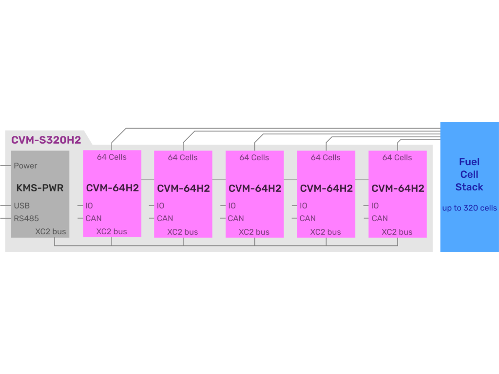 Adapted for research and testing purposes, the CVM-64H2 Series offers excellent accuracy and is designed primarily for hydrogen fuel cells and smaller electrolyzers. These ready-to-use cell voltage monitor sets are easily integrated into specialized applications and allow direct connection to a PC via USB or to a PLC via RS-485 or CAN bus.