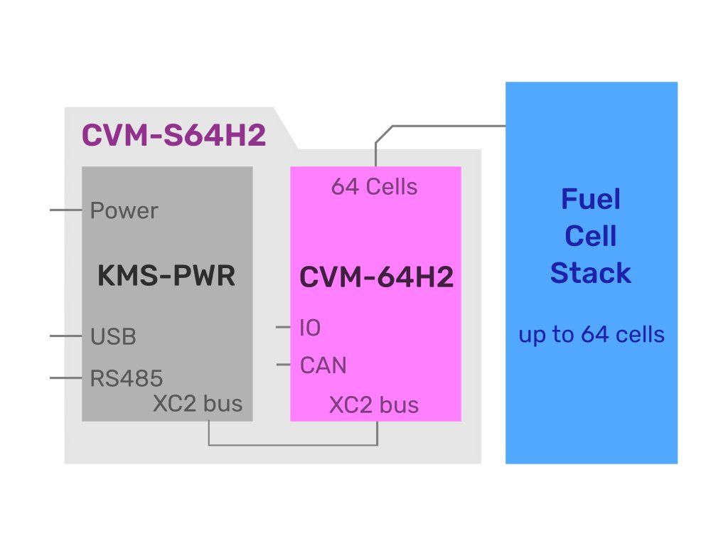 Adapted for research and testing purposes, the CVM-64H Series offers excellent accuracy and is designed primarily for hydrogen fuel cells and smaller electrolyzers. These ready-to-use cell voltage monitor sets are easily integrated into specialized applications and allow direct connection to a PC via USB or to a PLC via RS-485 or CAN bus.