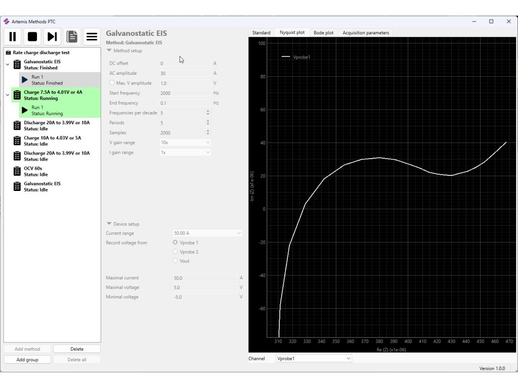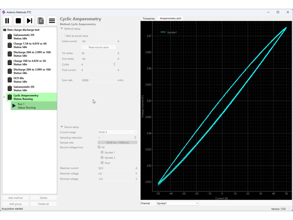 | Acquitions methods | Constant V, I, Open circuit, Manual control, Linear Sweeps, Cyclic Voltammetry, Cyclic Amperometry, Electrochemical Impedance Spectroscopy (EIS), Chronoamperometry, Chronopotentiometry, Double Step Chronoamperometry, Double Step Chronopotentiometry, Current Interrupt, Square Pulse Potentiometry, Square Pulse Amperometry, Battery Charge and Discharge, Custom experiment sequences, Python scripting |