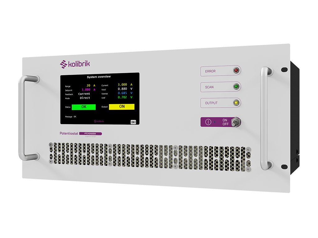 The PTC-10100EW is the most powerful Potentiostat/Galvanostat in the Kolibrik Potentiostat Product Family, designed to push the boundaries of electrochemical research. Delivering up to ±100 A current, the PTC-10100EW handles even the most demanding electrochemical experiments.